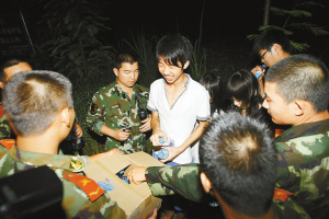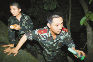 又過了20分鐘,救援官兵的呼喊聲又開始有了回應(yīng),官兵的心情馬上變得振奮起來,他們再一次有了前進(jìn)的動力,緊張的心情稍有舒緩。他們在原本沒有道路的荊棘、樹木和雜草叢中硬是強(qiáng)行爬了過去,誰知一路走了許久,仍是沒有見到孩子們的身影。長時間緊急搜尋,使救援官兵的聲音開始嘶啞,體力開始下降,但他們沒有因此而放棄搜救,在他們的心里,此時只有一個目標(biāo),就是盡快再盡快找到被困的學(xué)生,因為此時已距他們上山有10個小時,學(xué)生們一定是又餓又困又凍了。